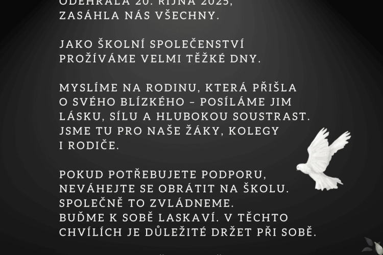 21.10.2025 Škola prožívá velký smutek Vážení rodiče, milí žáci, kolegové, přátelé školy, s hlubokým zármutkem oznamujeme, že dne 20. října 2025 došlo v naší škole k tragické události,…